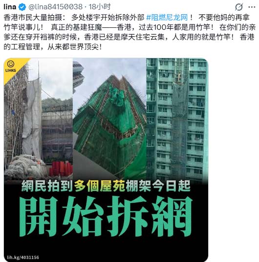 據「香港01」報導,火災發生前,負責宏福苑外牆裝修工程的宏業建築,在香港還承包了11處大樓外牆裝修工程。