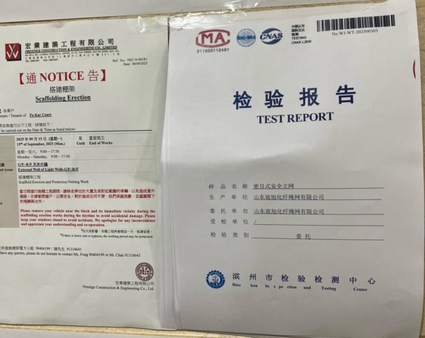 其中,「富澤花園富嘉閣」及「怡樂花園」的居民先後出示社區張貼的檢測報告,指兩地大樓施工使用的防護網分別由「山東宸旭化纖繩網有限公司」及「濱州市源進化纖繩網有限公司」生產,品名為「阻燃密目網」,而且都是由山東省濱州市檢驗檢測中心檢測通過。