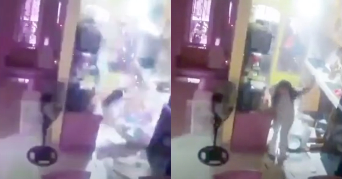 一名男子聽到廚房巨響和女子的尖叫聲,連忙從房間裡走出來,跑到廚房看個究竟,也被雷擊現場驚得目瞪口呆,家中的孩子也嚇得大哭。