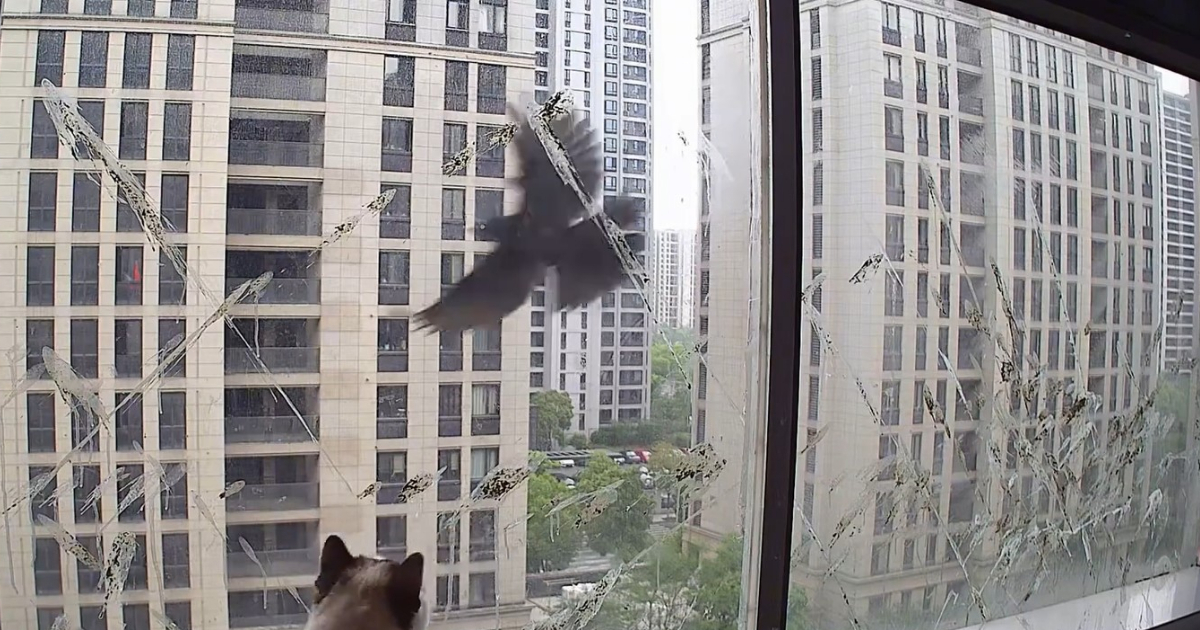 監控視頻顯示,早上8點左右,一隻烏鶇一閃飛過,陽台玻璃上留下一道道屎跡。陽台上一隻貓則盯著飛過的烏鶇。這位網友發文求助說,「怎樣才能把這鳥趕走?」
