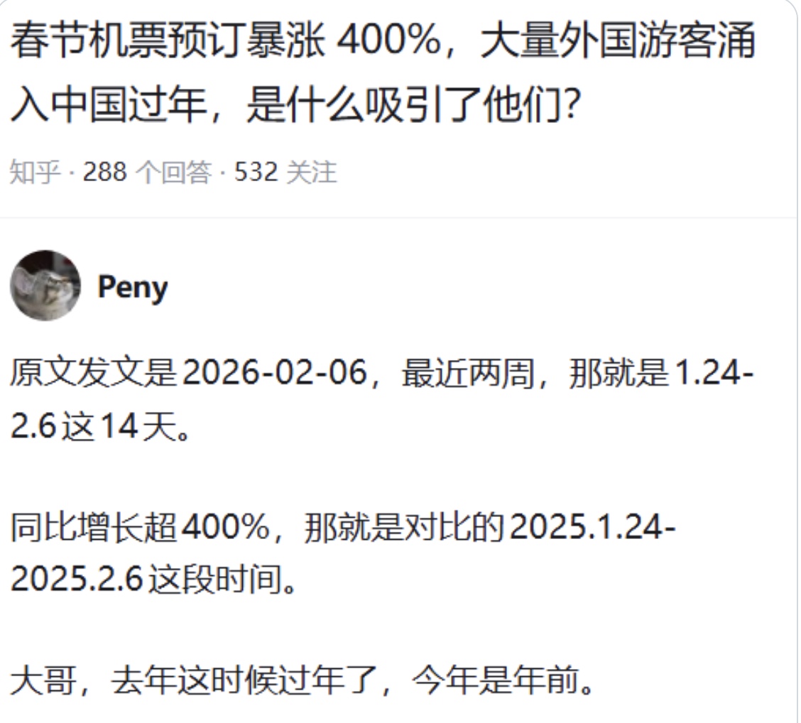 網友質疑,「原文發文是2026-02-06,最近兩週,那就是1.24-2.6這14天。同比增長超400%,那就是對比的2025.1.24-2025.2.6這段時間。大哥,去年這時候過年了,今年是年前」。
