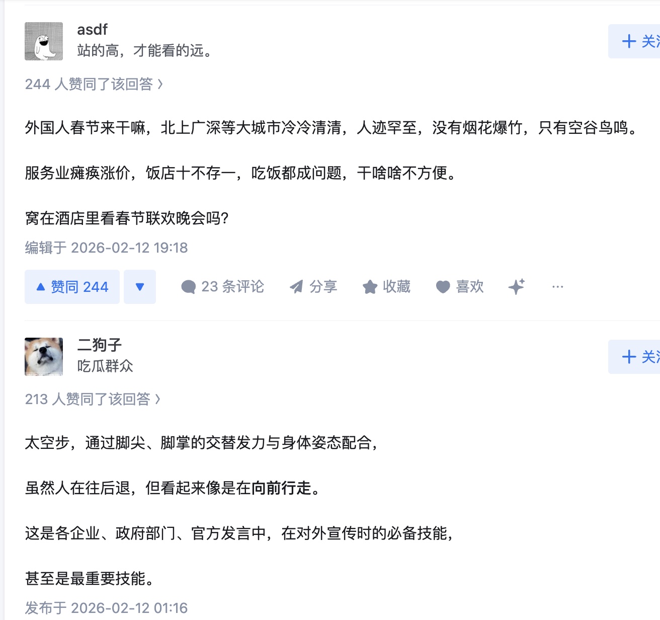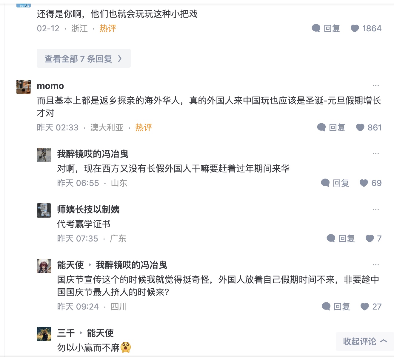 還有網友從常識分析,「老外跑中國過年才是騙傻子呢,首先老外休假核心時間也是不中國春節,其二,中國春節都休假了,老外過來幹啥呢,要吃的沒有,要玩的人擠人」「別說來中國過春節,店鋪大面積歇業,假期初和末極大交通壓力,連旅遊都是錯誤的時機」「外國人春節來幹嘛,北上廣深等大城市冷冷清清,人跡罕至,沒有煙花爆竹,只有空谷鳥鳴。服務業癱瘓漲價,飯店十不存一,吃飯都成問題,幹啥啥不方便。窩在酒店裡看春節聯歡晚會嗎?」