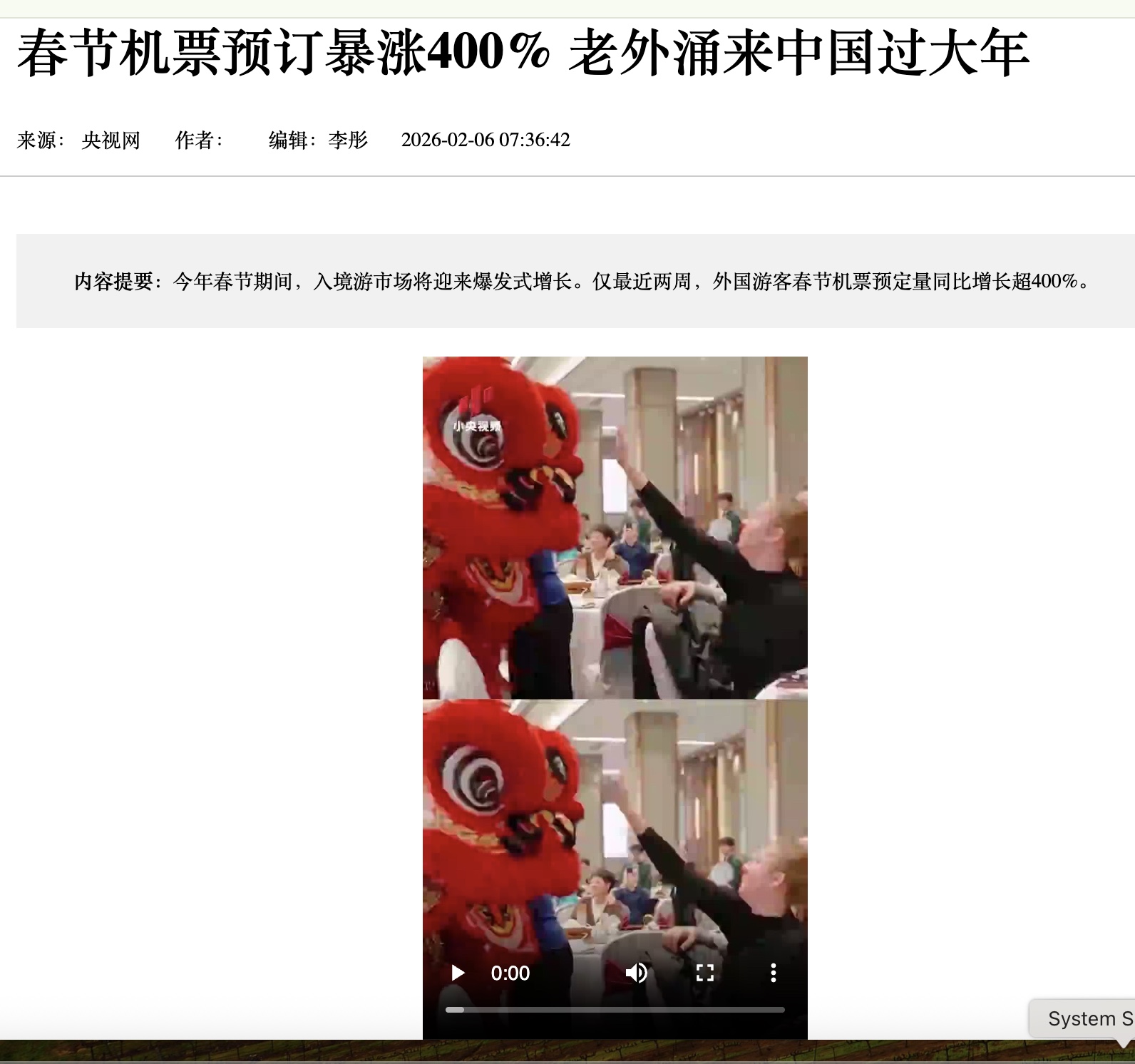 2月6日,中共央視新聞網稱,今年過年期間,「入境游市場將迎來爆發式增長。僅最近兩週,外國遊客春節機票預定量同比增長超400%」。