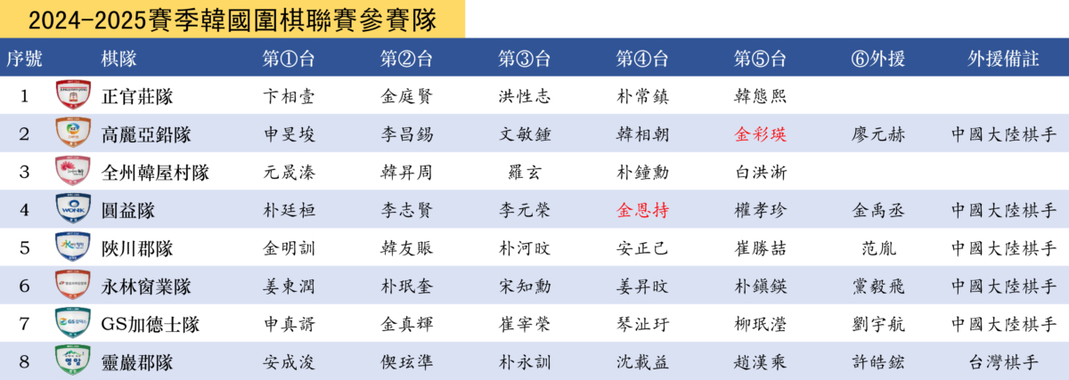 【新唐人北京時間2024年12月12日訊】2024年12月12日起,2024-2025賽季「KB國民銀行韓國圍棋聯賽」拉開戰幕。本賽季聯賽與上賽季聯賽賽制基本相同,同樣由8支參賽隊組成,並規定每支隊伍允許邀請一位外援參戰。