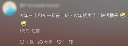 甚至有網友直言,過年也不敢休息,「大年三十和初一都在上班,過年就買了十塊錢橘子。」