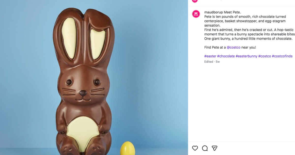 這款巧克力兔子由牛奶巧克力、白巧克力和黑巧克力製成。生產商明尼蘇達州食品公司Maud Borup介紹說,它的名字叫皮特(Pete),非常適合在復活節早晨給孩子們一個驚喜。