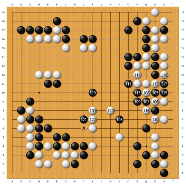 當黑121點刺時,白棋錯失A位要點,而下出白122的敗招,此後申真諝陷入苦戰,雖然通過打劫做活了大龍,但大龍尾巴被對手割下,白棋敗勢盡顯。