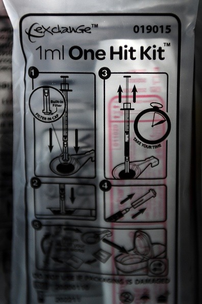 A “One Hit Kit”, containing a sterile syringe, needle and spoon, is pictured inside former drug user-turned-drug policy campaigner Peter Krykant’s “Safe Consumption” van, a mobile sterile drugs consumption facility he runs, in Glasgow on September 11, 2020. (Photo by ANDY BUCHANAN / AFP)