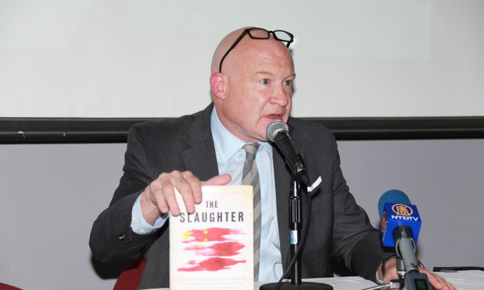 China analyst and human rights investigator Ethan Gutmann, author of “The Slaughter: Mass Killings, Organ Harvesting, and China’s Secret Solution to Its Dissident Problem,” speaks at a forum in Vancouver, Canada, on Oct. 25, 2014. (Sheng Yu/The Epoch Times)