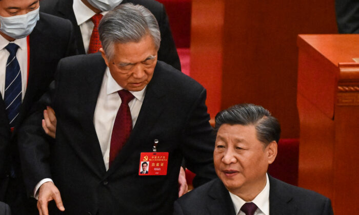 China’s leader Xi Jinping (R) watches as former leader Hu Jintao (C) touches the shoulder of Premier Li Keqiang (2nd L) as he leaves the closing ceremony of the 20th Chinese Communist Party’s Congress at the Great Hall of the People in Beijing on Oct. 22, 2022. (Noel Celis/AFP via Getty Images)