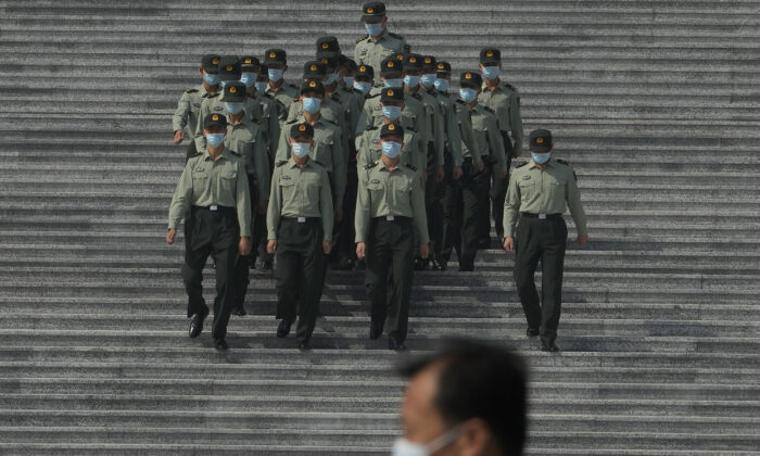 Chinese military officers march down the steps of the Great Hall of the People in Beijing on Sept. 27, 2022. The upcoming 20th National Congress of the Chinese Communist Party is set to take place at this location on Oct. 16, 2022. (AP Photo/Ng Han Guan)