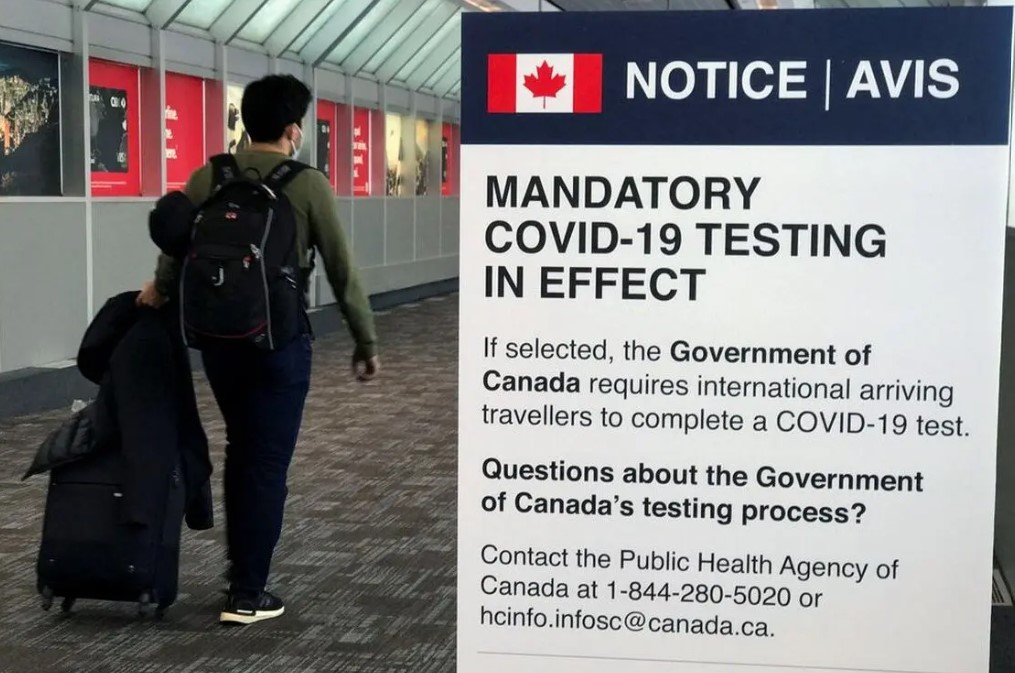 A traveler walks past a “Mandatory COVID-19 Testing” sign at Pearson International Airport during the coronavirus disease (COVID-19) pandemic of Toronto, Ontario, on Dec. 18, 2021. (Reuters/Carlo Allegri)
