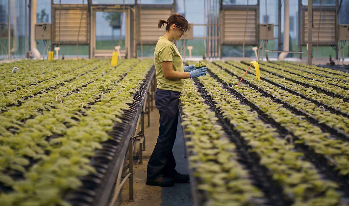 An worker inspects the Nicotiana benthamiana plants at Medicago greenhouse in Quebec City, August 13, 2014. (REUTERS/Mathieu Belanger)