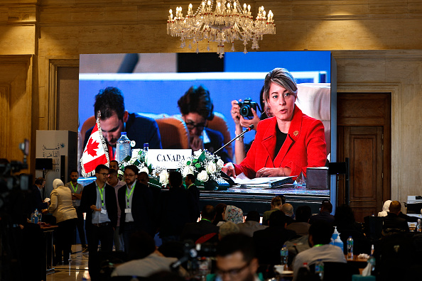 Journalists watch a large screen showing Minister of Foreign Affairs Melanie Joly addressing the International Peace Summit hosted by the Egyptian president in the New Administrative Capital (NAC), east of Cairo, on October 21, 2023, amid the ongoing battles between Israel and the Palestinian group Hamas. (Photo by KHALED DESOUKI/AFP via Getty Images)