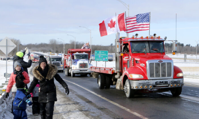 Trucks participating in the “Freedom Convoy” depart from an area south of Montreal on Jan. 28, 2021. (Noé Chartier/The Epoch Times)
