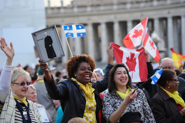 Canadian faithful wave their national flag and the flag of Quebec (L) as they wait for the start of a canonisation mass led by Pope Benedict XVI at St Peter’s square on October 17, 2010 at The Vatican. (Photo by CHRISTOPHE SIMON/AFP via Getty Images)