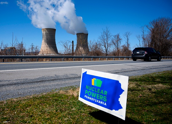 A car drives past the operational nuclear plant on Three Mile Island, run by Exelon Generation, in Middletown, Pennsylvania on March 26, 2019. (Photo by ANDREW CABALLERO-REYNOLDS / AFP)