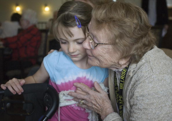 Young Jessica from Kids and Company daycare gets a hug from Rose while visiting the Millrise Place retirement home 15 June 2007 in Calgary, Alberta (Photo by DAVID BOILY/AFP via Getty Images)