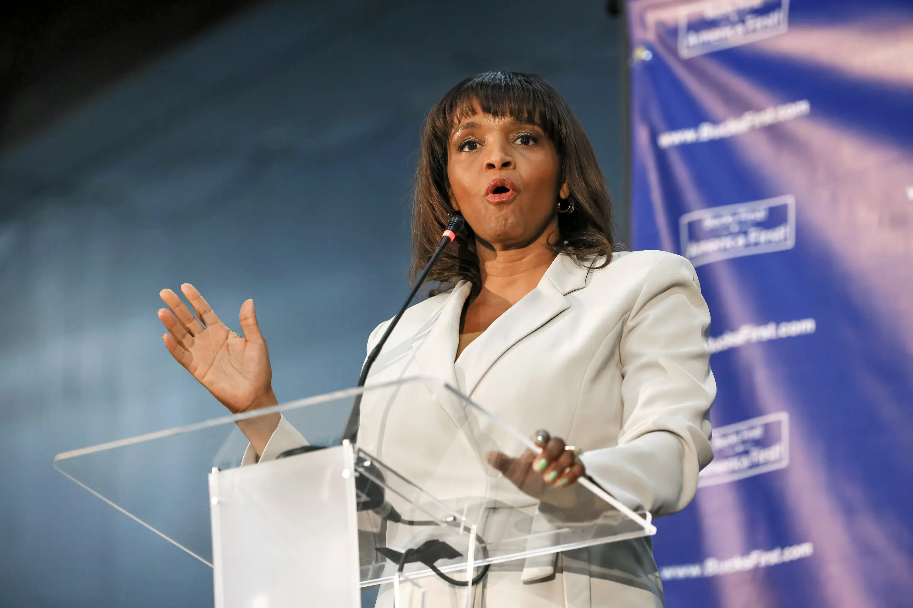 Pennsylvania U.S. Senate Republican candidate Kathy Barnette speaks during a Republican leadership forum at Newtown Athletic Club in Newtown, Pa., on May 11, 2022. In 2022, Wikipedia deleted its page on Barnette, saying she was not a notable person. The page was later restored. Michael M. Santiago/Getty Images