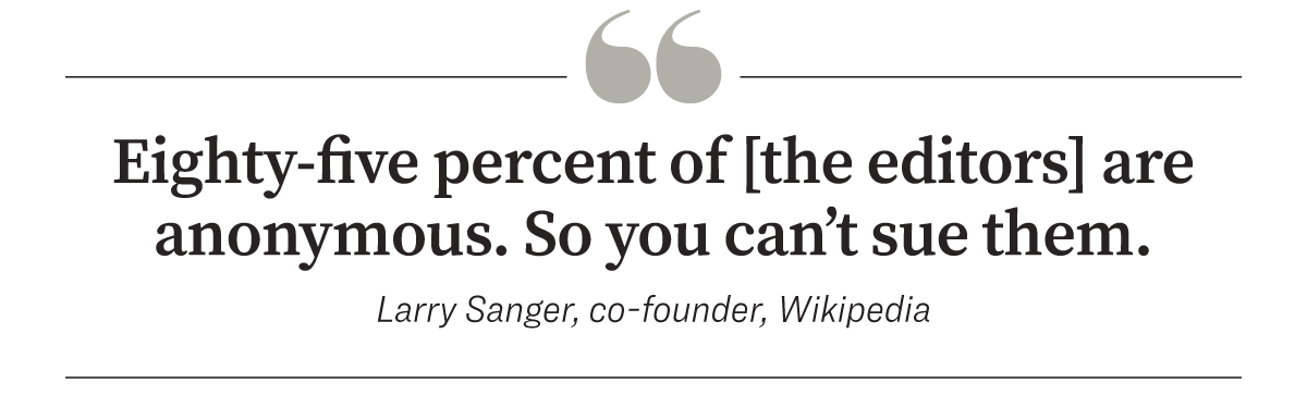 The anonymity of the majority of Wikipedia’s 62 most influential editors perpetuates the problem, Sanger said, noting it creates a situation in which no one is held responsible for the potential harm the site’s content may cause.