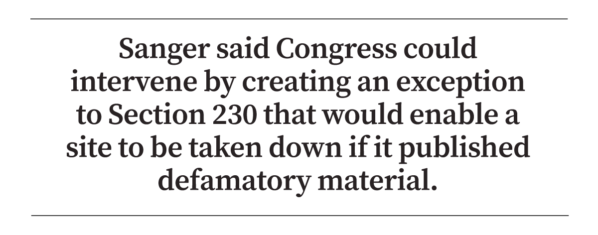 As a last resort, Sanger said Congress could intervene by creating an exception to Section 230 that would enable a site to be taken down if it published defamatory material. A precedent exists, according to Sanger, who cited a 2018 law that created a similar exception for websites used to organize human trafficking.