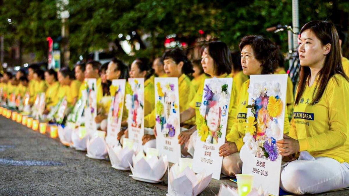 Falun Gong practitioners participate in a candlelight vigil, holding photos of fellow adherents who have died as a result of persecution in China, in front of the Chinese Consulate in Toronto on July 13, 2019. The Epoch Times