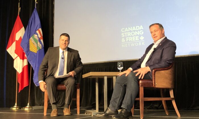 Alberta Premier Jason Kenney (R) talks to host Sean Speer at the Canada Strong and Free Networking Conference at the Cambridge Hotel & Conference Centre in Red Deer, Alta., on Sept. 24, 2022. (Noé Chartier/The Epoch Times)