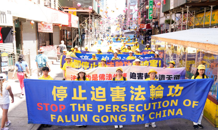 Falun Gong practitioners take part in a parade to commemorate the 23rd anniversary of the persecution of the spiritual discipline in China, in New York’s Chinatown on July 10, 2022. (Larry Dye/The Epoch Times)