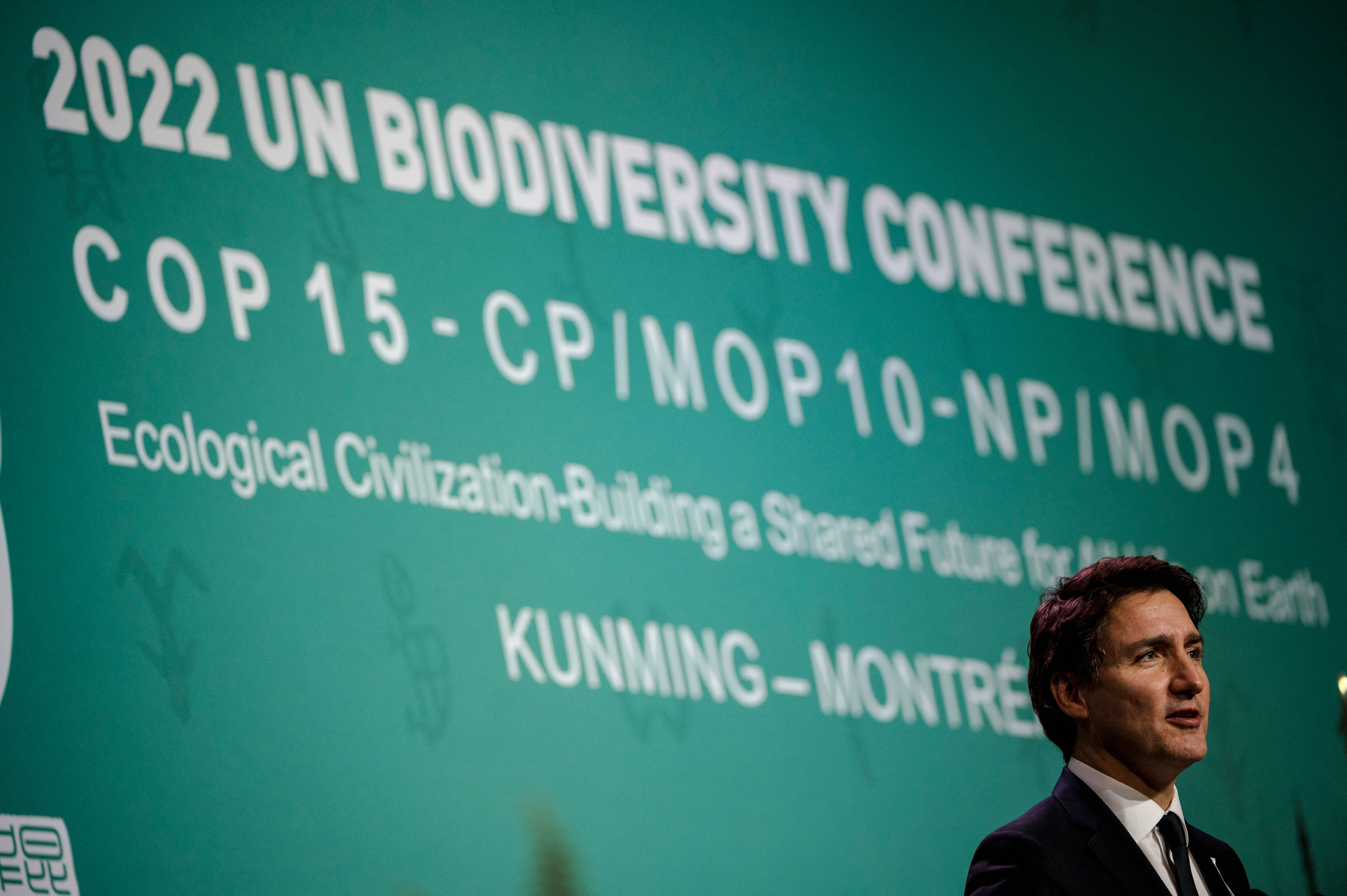 Prime Minister Justin Trudeau speaks during the opening ceremony of the United Nations Biodiversity Conference (COP15) in Montreal, Quebec, on December 6, 2022. (Photo by Andrej Ivanov / AFP via Getty Images)