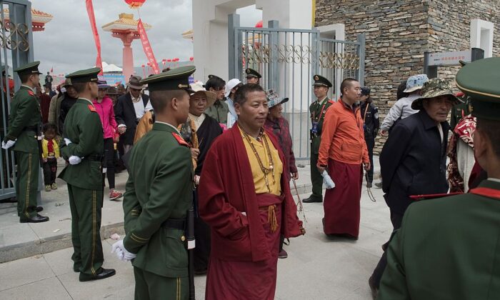 Chinese paramilitary police (in green uniforms) secure an exit as Tibetans monks walk out from a stadium at the end of at a local government-sponsored festival in Yushu, in the northwestern Chinese province of Qinghai, on July 25, 2016. (Nicolas Asfouri/AFP via Getty Images)