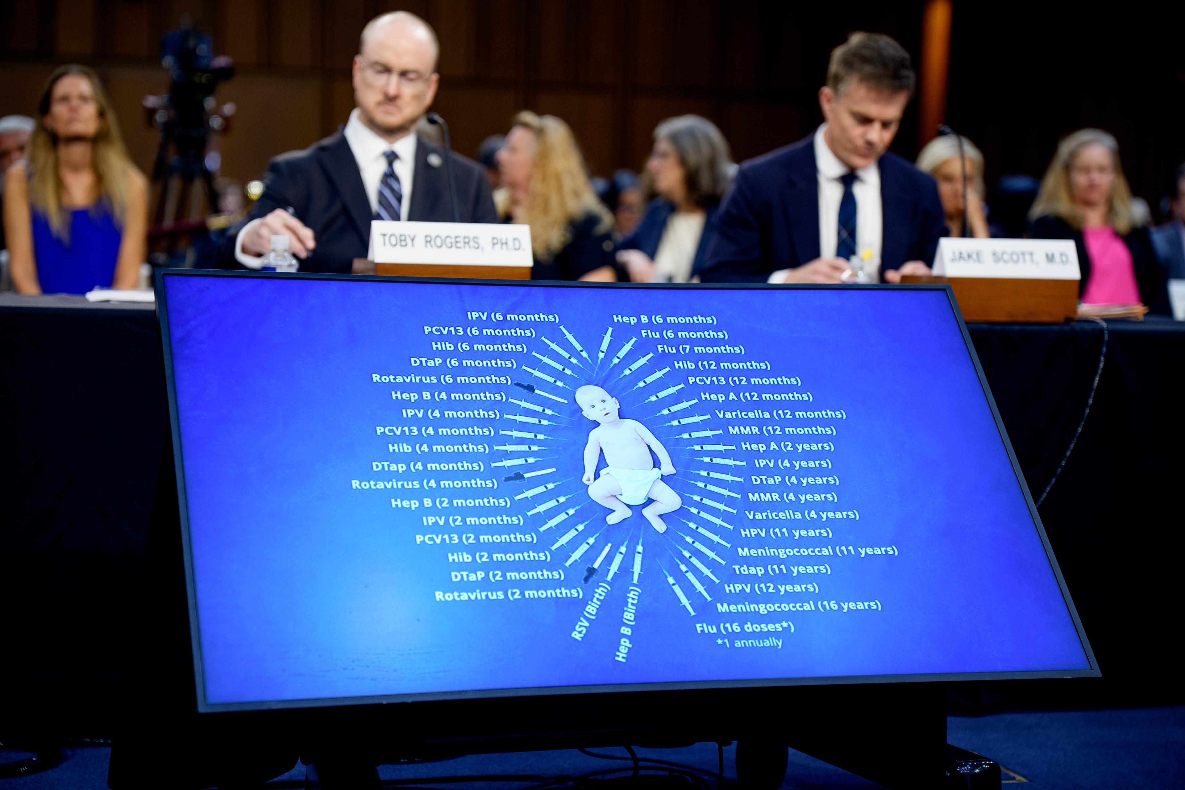 A child surrounded by a list of shots is depicted on a monitor during a Senate hearing in Washington on Sept. 9, 2025. Andrew Harnik/Getty Images