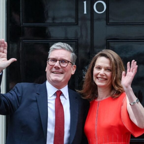 Britain’s incoming Prime Minister Keir Starmer and his wife Victoria wave as they pose on the steps of 10 Downing Street in London on July 5, 2024. (Justin Tallis/AFP via Getty Images)