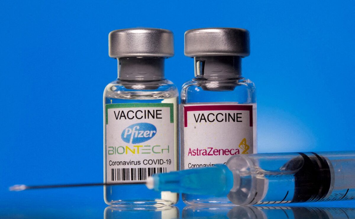 Vials with Pfizer-BioNTech and AstraZeneca COVID-19 vaccine labels are seen in this illustration picture taken on March 19, 2021. (Dado Ruvic/Illustration/Reuters)