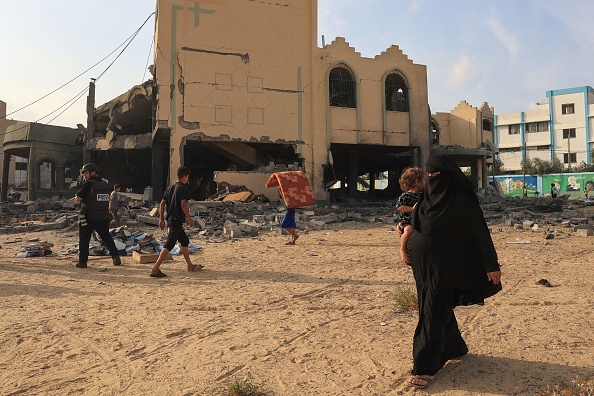 A journalist and civilians walk past a damaged building in Khan Yunis, following Israeli airstrikes on the southern Gaza Strip, on October 8, 2023. Fighting between Israeli forces and the Palestinian militant group Hamas raged on October 8, with hundreds killed on both sides after a surprise attack on Israel prompted Prime Minister Benjamin Netanyahu to warn they were “embarking on a long and difficult war”. (Photo by SAID KHATIB / AFP)