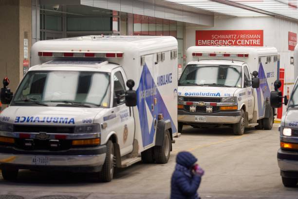 The emergency department at Mount Sinai Hospital in Toronto with a fleet of ambulances wait on January 5, 2022. (Photo by Geoff Robins / AFP via Getty Images)