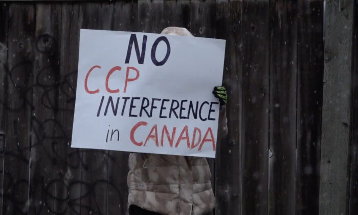 A protester holds a sign that reads “No CCP interference in Canada” at a rally outside of the Wenzhou Friendship Society in Richmond, B.C., on Feb. 25, 2023. (Vivian Yu/NTD)