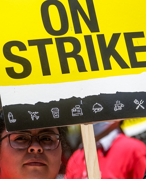 A striking worker walks the picket line outside the Intercontinental Hotel in Los Angeles, California, on July 2, 2023. (Photo by RINGO CHIU/AFP via Getty Images)