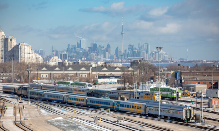 VIA Rail trains are seen parked at VIA Rail’s Toronto Maintenance Centre at Union Station in Toronto, Ontario, on Feb. 14, 2020. (Carlos Osorio/Reuters)