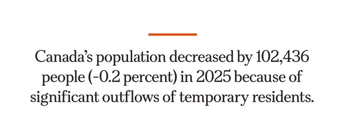 According to Statistics Canada data released on March 18, Canada’s population fell by 0.2 percent, or 102,436 people, in 2025 because of significant outflows of temporary residents. The total number of temporary residents has fallen from its 2024 peak of roughly 3.1 million to slightly less than 2.7 million.