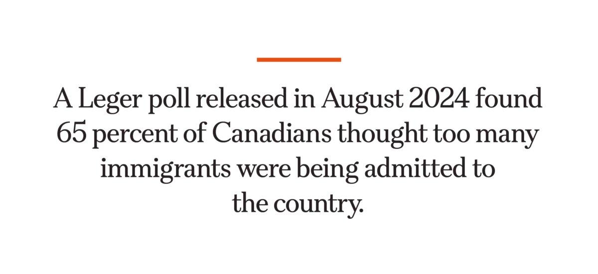 A Leger poll released in August 2024 indicated 65 percent of Canadians felt current immigration levels were too high, with a majority in all regions, age groups, and genders sharing this view.