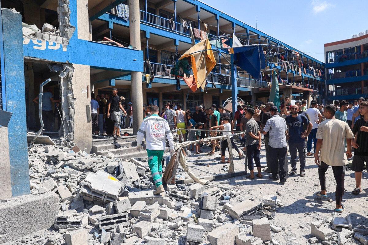 Palestinians survey the damage following an Israeli military bombardment of a UNRWA (United Nations Relief and Works Agency for Palestine Refugees) facility in the Nuseirat refugee camp, in the central Gaza Strip on July 14, 2024. Eyad Baba/AFP via Getty Images
