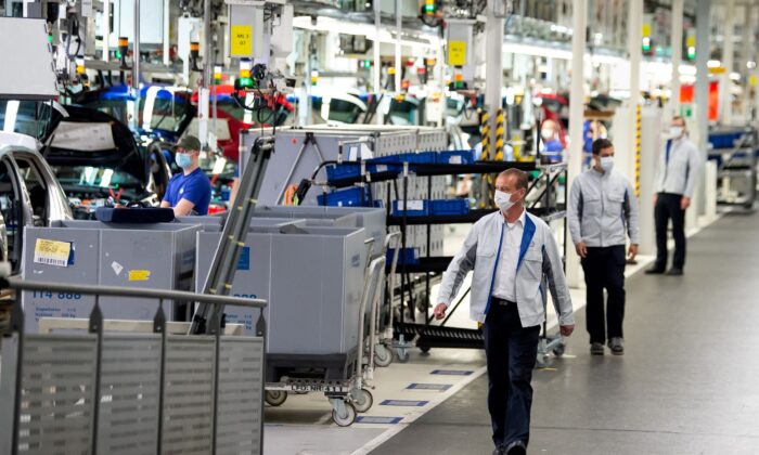 Staff on the Volkswagen assembly line in Wolfsburg, Germany on April 27, 2020. (Swen Pfoertner/Pool via Reuters)
