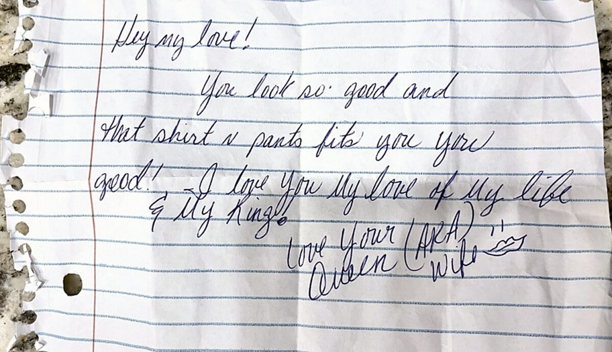 “Hey my love! You look so good and that shirt ‘n pants fits you good! I love you my love of my life & my king,” the note reads, using the couple’s practice of referring to each other with royal titles. “Love, your Queen (AKA wife).”